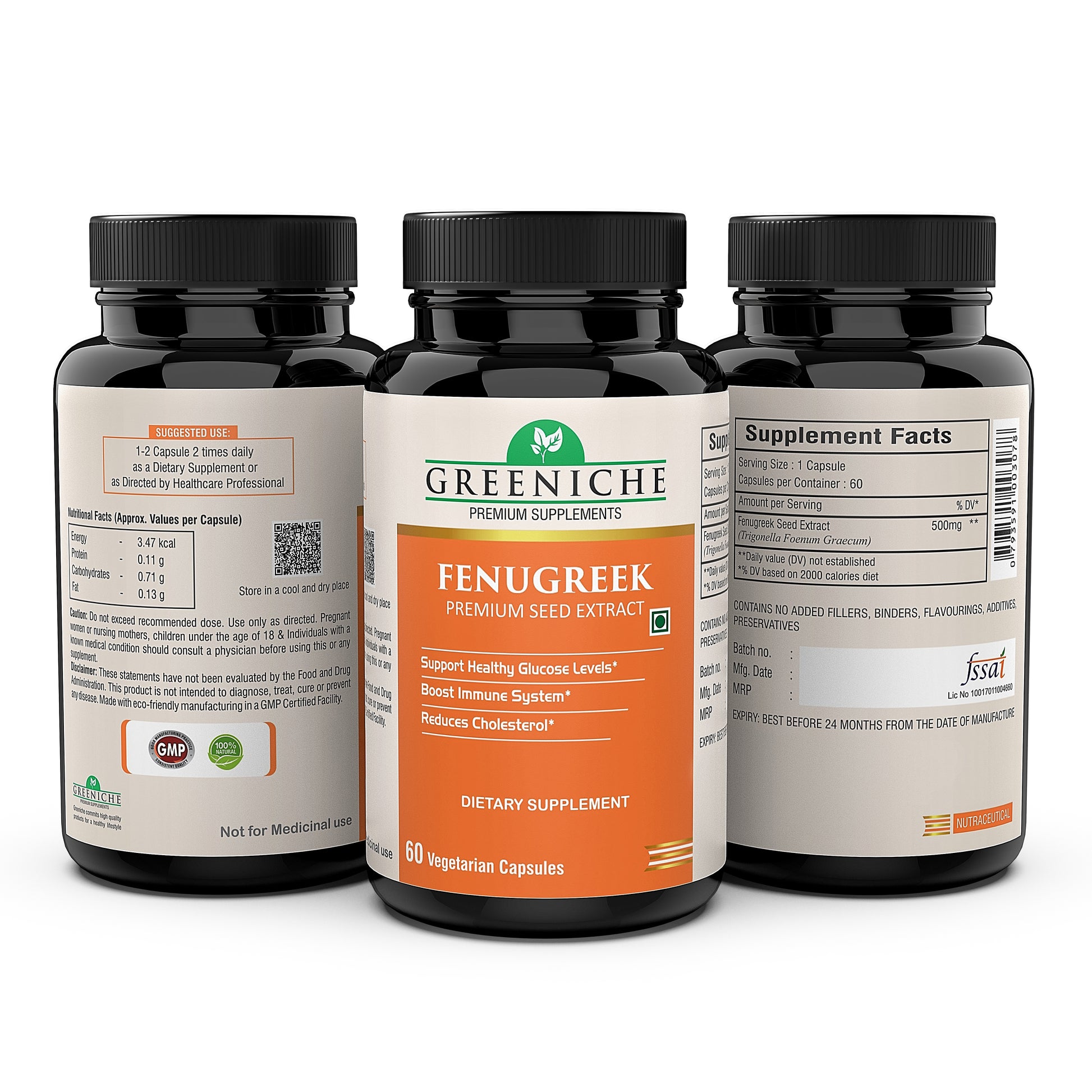 FENUGREEK: Using the herb Fenugreek can cause various health benefits. Some benefits can include Supports healthy blood glucose levels, Lactation Support; Fenugreek is widely used to support lactation for women’s health, Relief from fevers, stomach problems, throat soreness, inflammation, respiratory disorders, mild insomnia, sores or ulcers in the mouth as well as other health related problems. Our Natural 60 Veg Capsules Supports Healthy Blood Sugar Level. Greeniche products are manufactured in accordance with the Good Manufacturing Practices (GMP), which is among the highest standards in the world. Greeniche comes with guaranteed purity & potency. We offer the best quality of products for the best value! All of our products are third party tested and contains no artificial colour. PACK SIZE- 60 CAPSULES (500 MG)