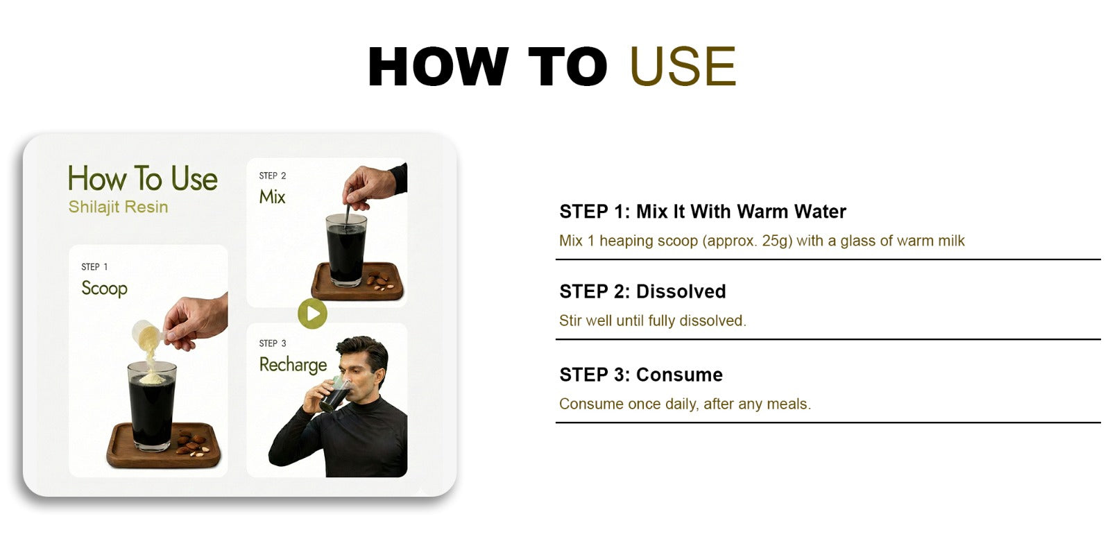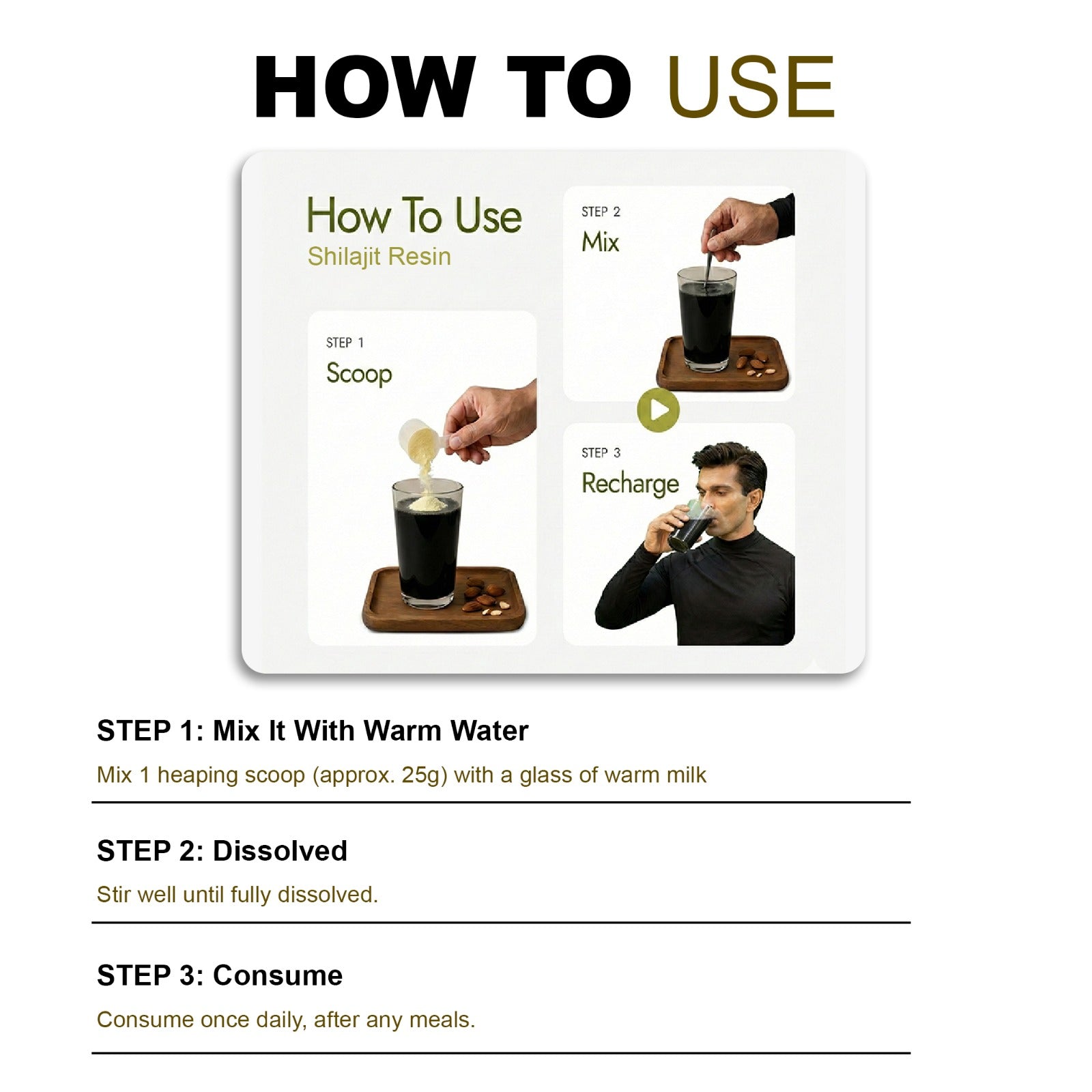 One pea-sized scoop contains approximately 400 mg of pure Shilajit resin.